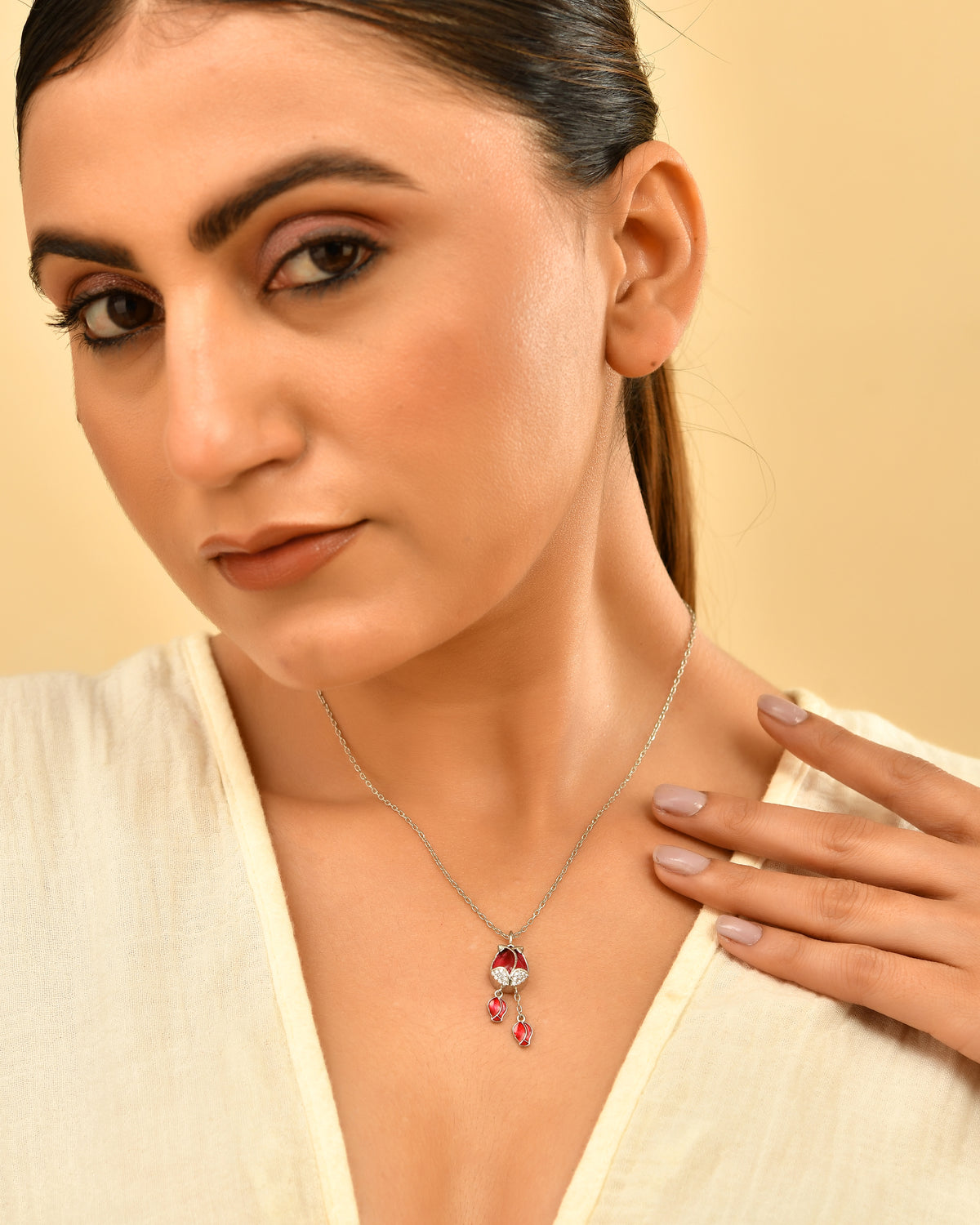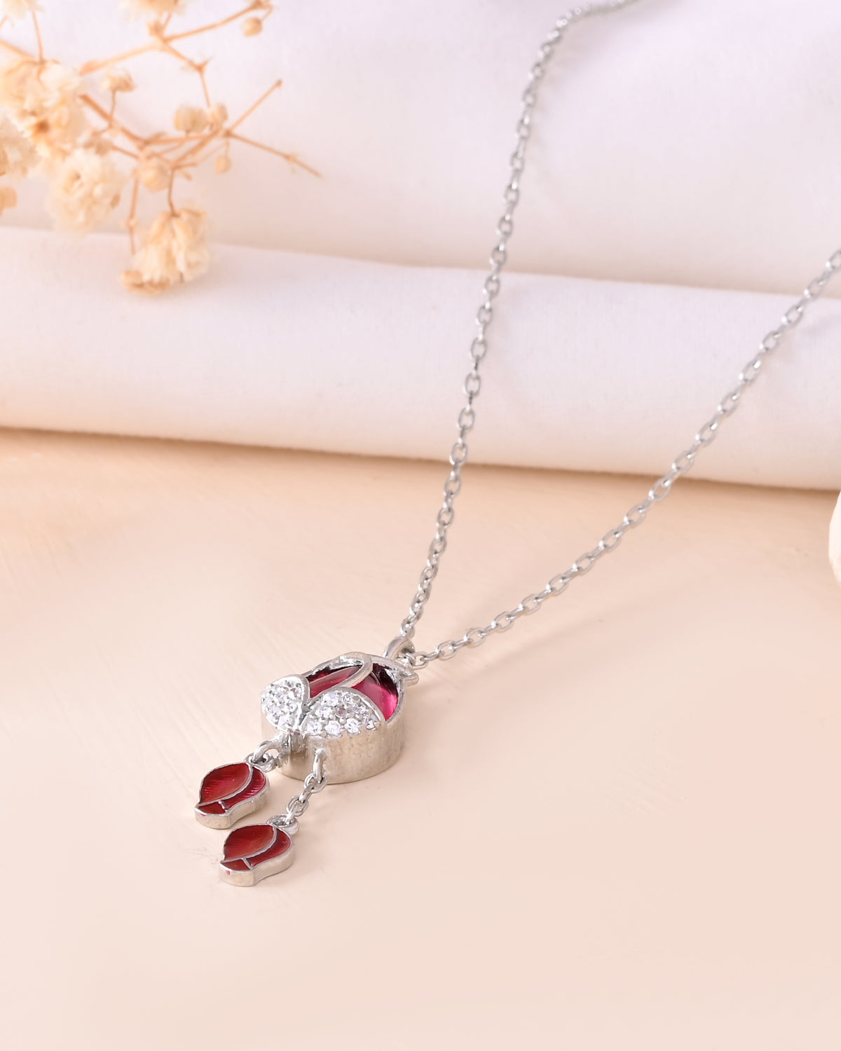 This silver-finish chain pendant features a rich crimson red enamel beautifully framed with a sleek 925 silver outline and graceful dangling drops. The elegant detailing gives it a perfect blend of traditional sophistication and modern style, making it ideal for both festive and everyday wear.